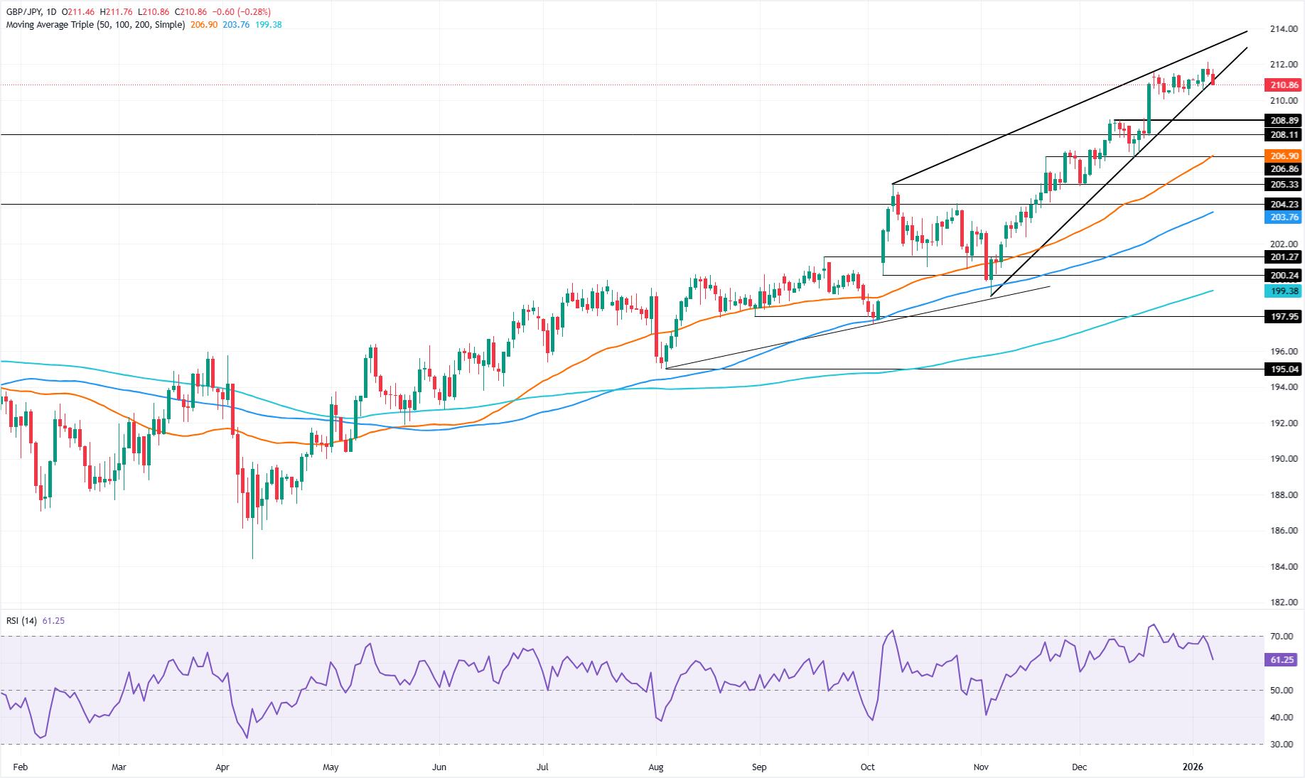 英镑/日元的技术面依然积极,但相对强弱指数(RSI)所描绘的突然动能转变表明回调在即。