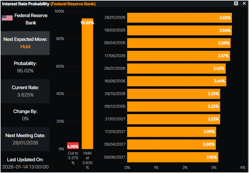 根据数据,市场预期美联储在一月份会议上将维持利率不变的概率為95%,根据Prime Market Terminal的数据显示。然而,货币市场仍然预期美联储基金利率将在3.23%结束,这意味著他们预期年底前将放鬆52个基点。