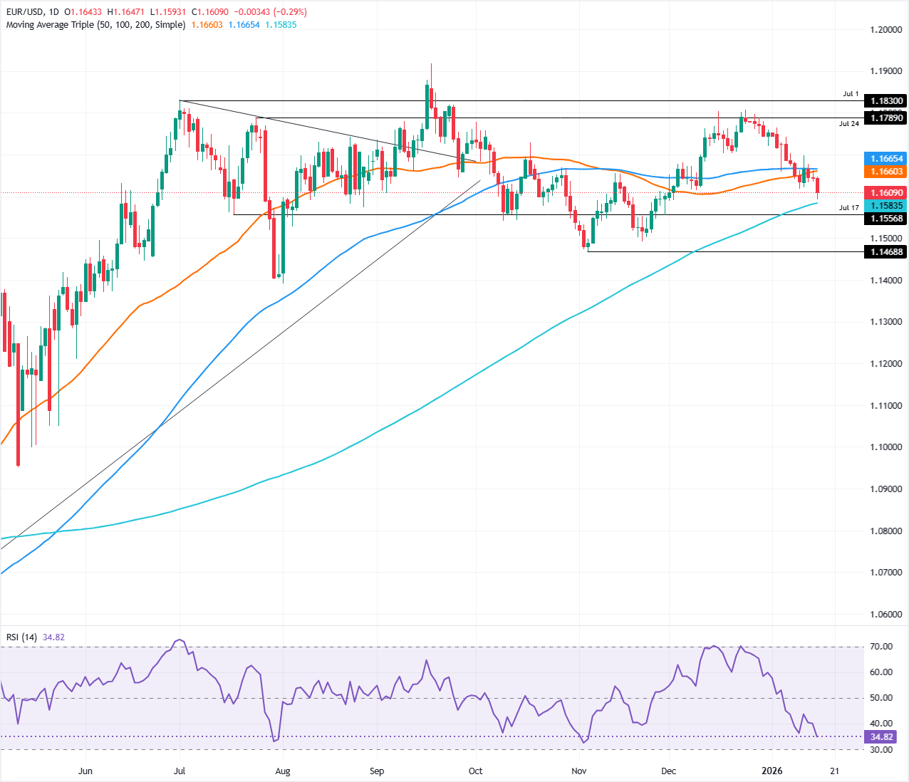欧元/美元在盘整中,短暂突破1.1600,触及年内低点1.1593,随后回升至1.1600。动能继续偏向卖方,相对强弱指数(RSI)保持在中性50水平以下,表明空头占据上风。