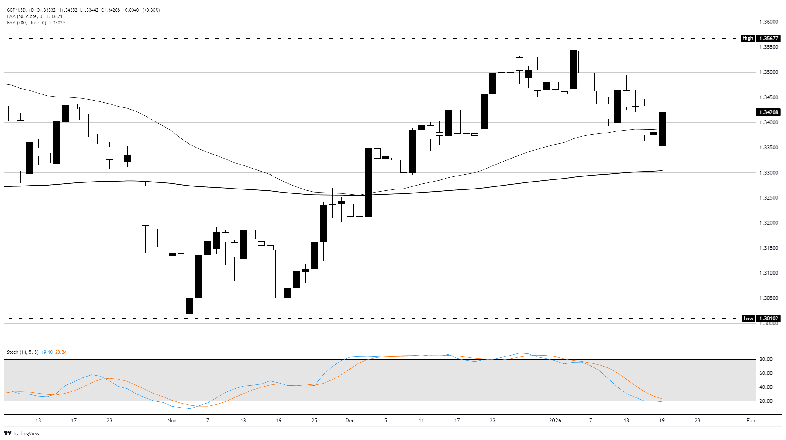 周一的早期看涨反弹為英镑/美元在50日指数移动均缐(EMA)下方1.3400附近提供了新的支撑,但整体价格走势仍倾向于看跌。自1月初未能突破1.3550水平以来,英镑/美元一直在缓慢下滑,随机振盪器仍显示出一些下行空间,侭管已接近超卖区域。