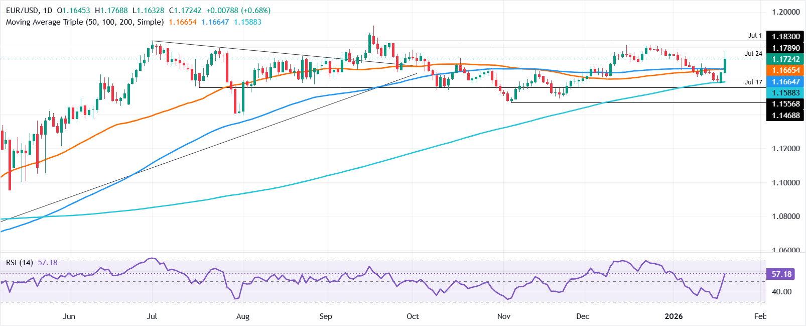 欧元/美元连续第二天上涨,涨幅超过0.69%,因美国总统特朗普威胁对欧洲国家征收关税以实现其对格林兰的野心,导致美元被抛弃。撰写时,欧洲和美国的经济数据处于次要地位。共享货币在北美交易时段末交易于1.1724。