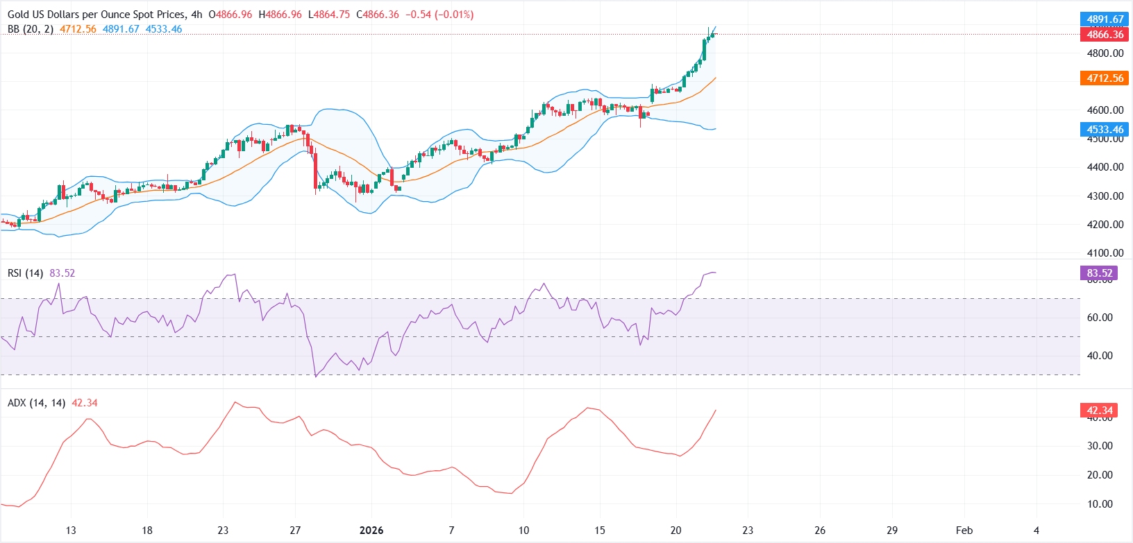 在下方,约4,699.64美元的中带标誌著第一层支撑,随后是接近4,531.13美元的下布林带。只要价格保持在该区域之上,整体看涨偏向将保持不变。