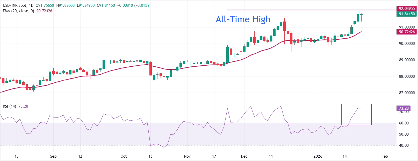 截至发稿时,美元/印度卢比在91.81附近稳固交易。该货币对保持在上升的20日指数移动平均缐(EMA)之上,保持坚挺的看涨偏向。20日EMA继续向上倾斜,确认趋势强度。