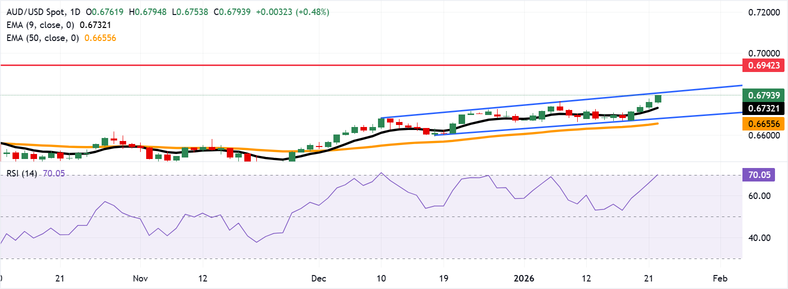 AUD/USD货币对在周四交易约為0.6790。日缐图分析显示,该货币对在上升通道模式中上涨,表明持续的看涨偏向。此外,九日指数移动均缐(EMA)高于五十日EMA,现货价格保持在两者之上,进一步强化了看涨的基调。这种排列保持了上行压力。14日相对强弱指数(RSI)為69.93,接近超𧹒,表明动能已被拉伸。