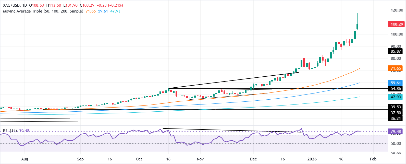 在这种情况下,XAG/USD的首个支撑位将是1月23日的日低96.14美元,随后是1月21日的摆动低点90.46美元。