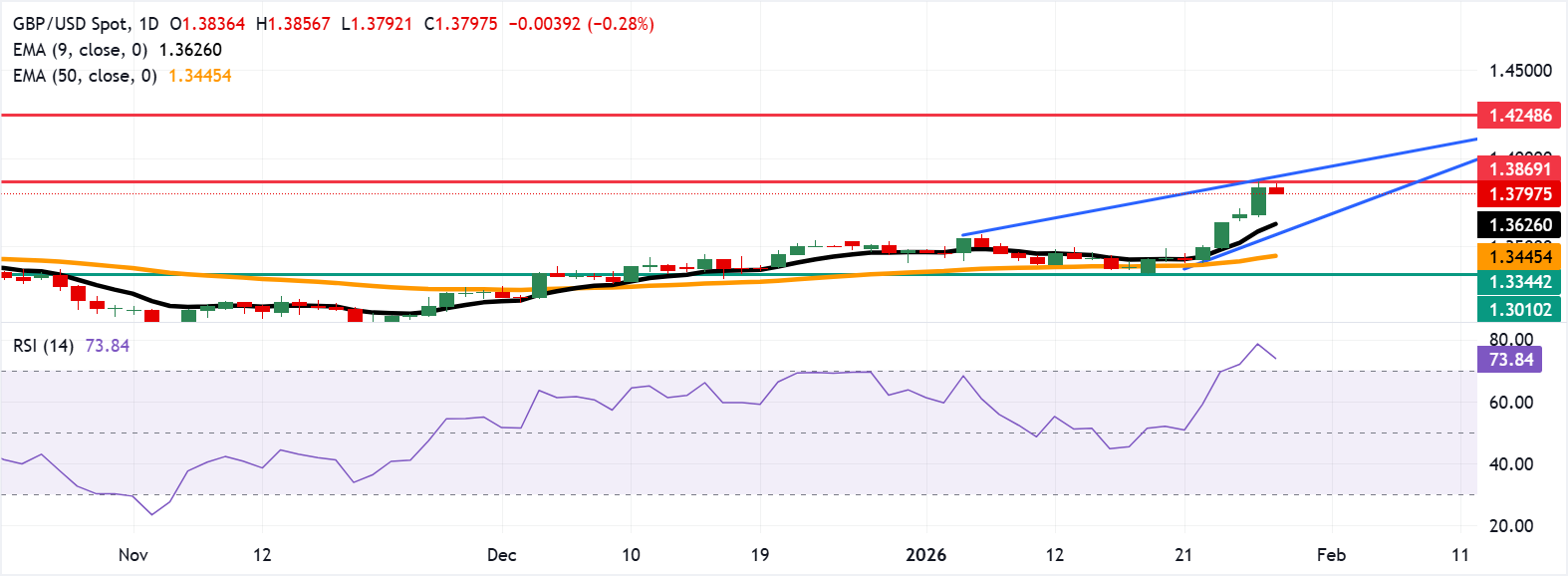 英镑/美元在连续四天上涨后贬值,周五亚洲时段交易于1.3800附近。日缐图的技术分析表明,在区间收窄的情况下,可能出现看跌反转,表明𧹒方在上升楔形模式中失去力量。
