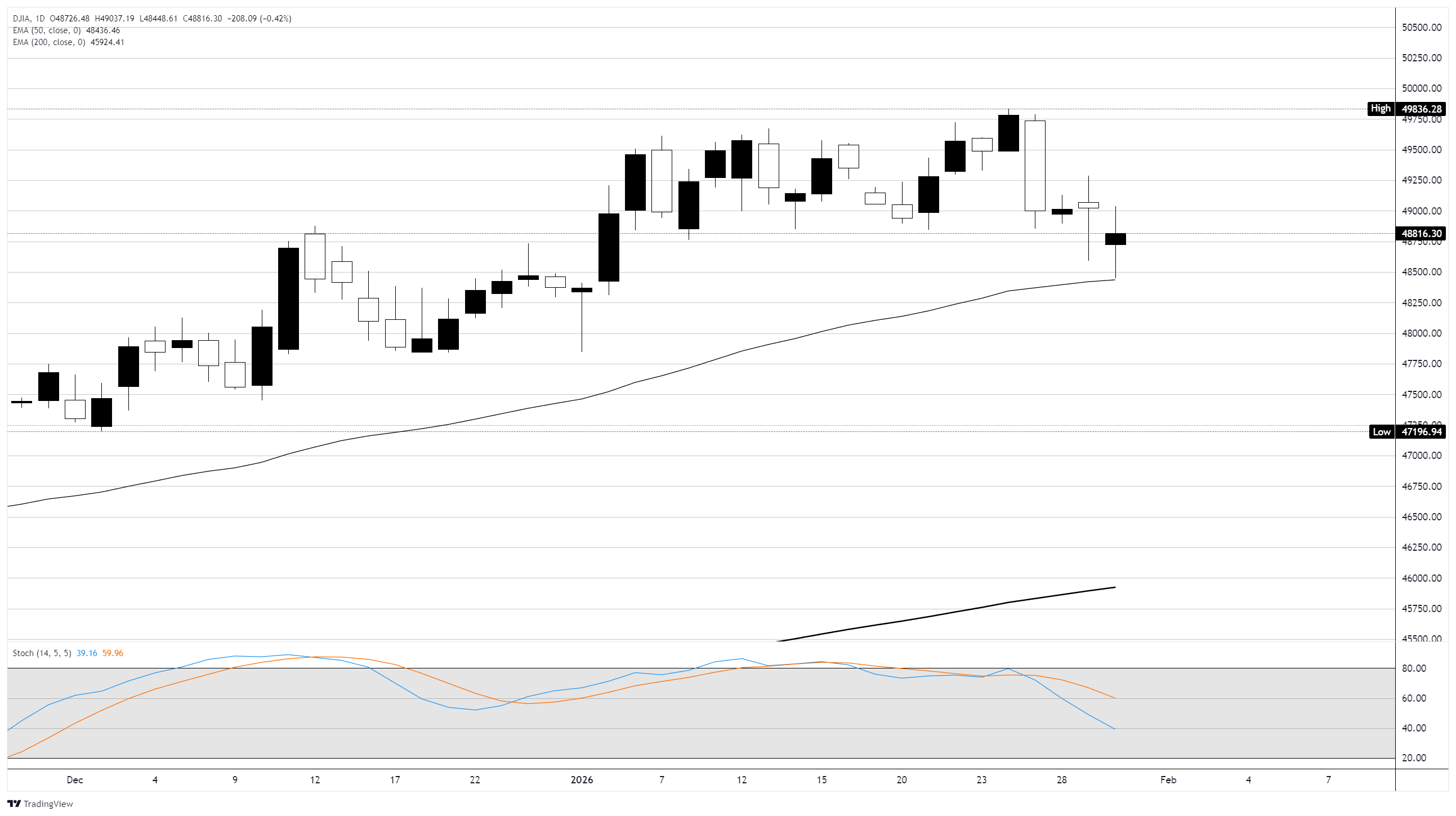 道琼斯工业平均指数(DJIA)周五下跌约200点,跌幅為0.2%,投资者权衡总统特朗普提名前美联储(Fed)理事凯文·沃什(Kevin Warsh)接替杰罗姆·鲍威尔(Jerome Powell)担任美联储主席的消息,鲍威尔的任期将于5月到期。标准普尔500指数也下跌0.2%,而纳斯达克综合指数下跌0.3%。侭管周五回调,三大主要指数在1月份均以稳健的涨幅收官:道琼斯上涨2.1%,标准普尔500指数上涨1.8%,纳斯达克上涨1.9%。