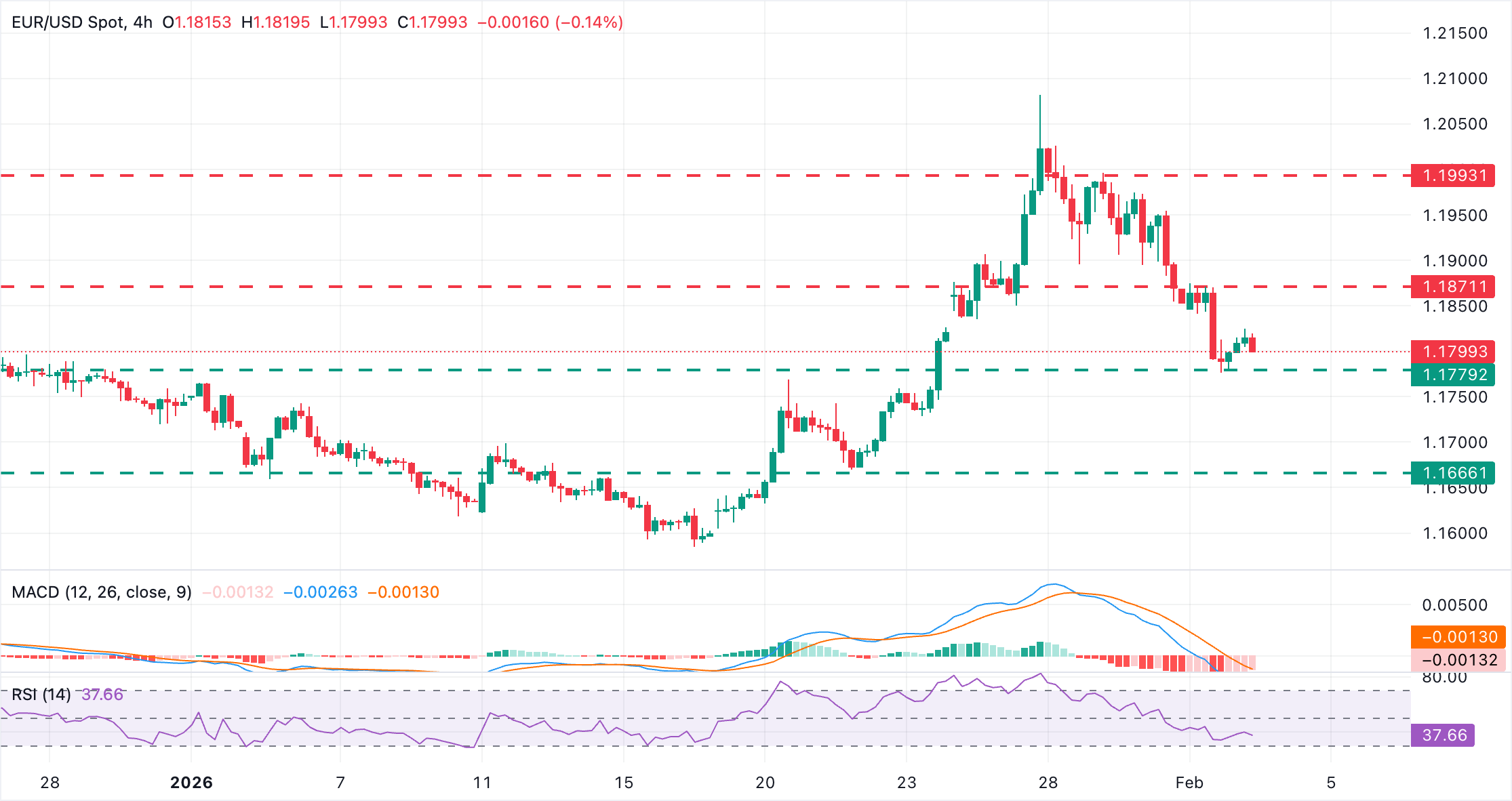 欧元/美元已从低点反弹,但短期趋势仍然看跌。4小时图上的相对强弱指数(RSI)在40附近向上指,显示出看跌动能正在减弱。与此同时,移动平均趋同背离(MACD)直方图显示红色柱状图在收缩,这表明卖压有所减轻。