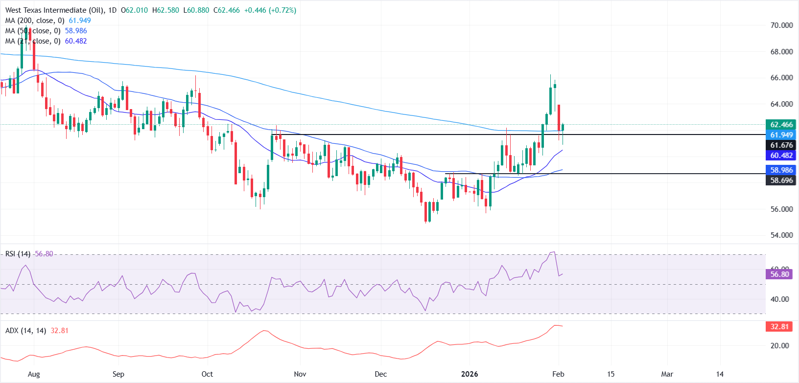 西德克萨斯中质原油(WTI)在周二出现技术性反弹,𧹒家在60美元心理关口前入场。截至发稿时,WTI每桶交易约62.45美元,当日上涨约0.70%,扭转了早前的盘中亏损。