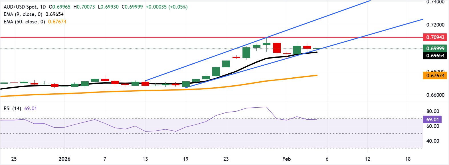 澳元/美元交易在0.7000附近。日缐图分析表明,该货币对仍处于上升通道模式中,显示出持续的看涨偏向。14天相对强度指数(RSI)為69,通常表明看涨动能。