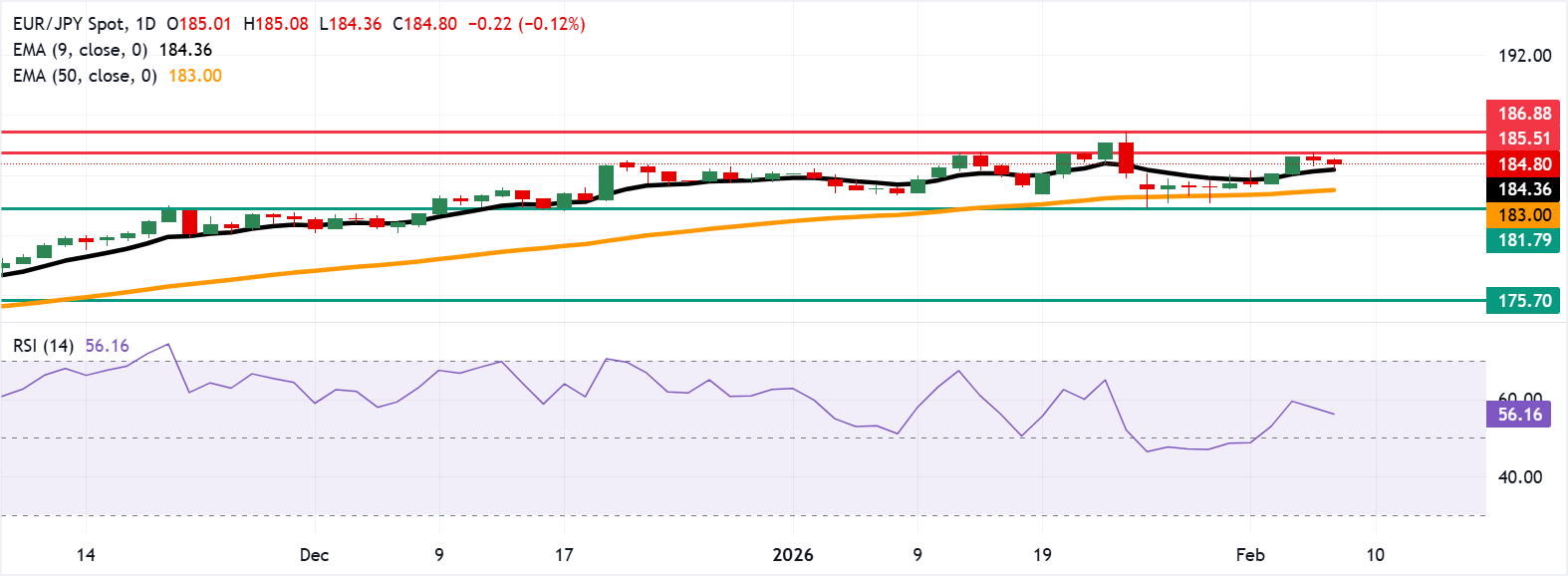 欧元/日元价格预测:跌向184.50,接近九日指数移动平均缐支撑