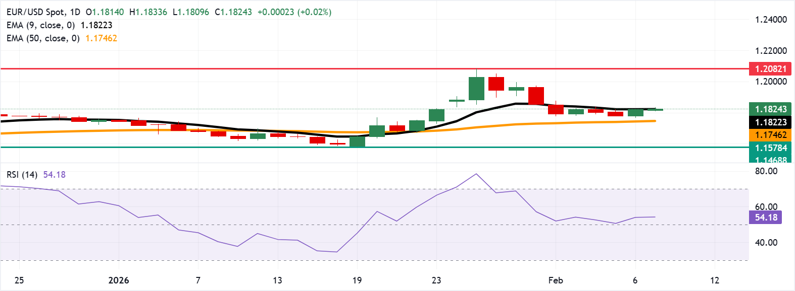 欧元/美元在前一交易日小幅上涨后仍处于积极区域,周一亚洲时段交投于1.1820附近。14日相对强弱指数(RSI)动量指标在54(中性)上升,信号显示动能改善。RSI接近中间50s保持动能平衡。若持续突破60,将巩固看涨控制。