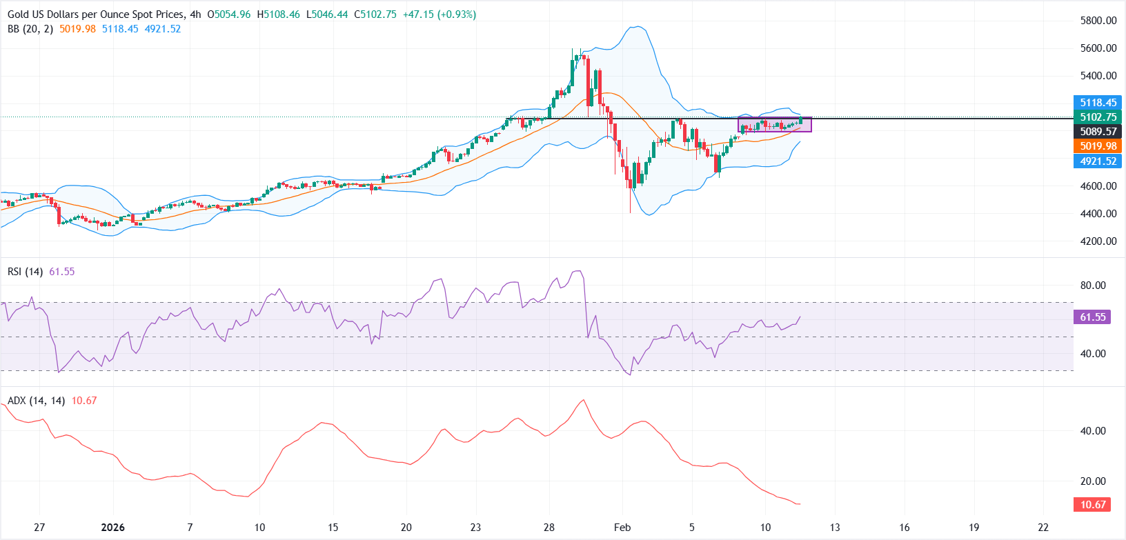 在4小时图上,价格徘徊在上方布林带的下方,位于5117.43美元,持续突破该水平可能会延续当前的上涨。