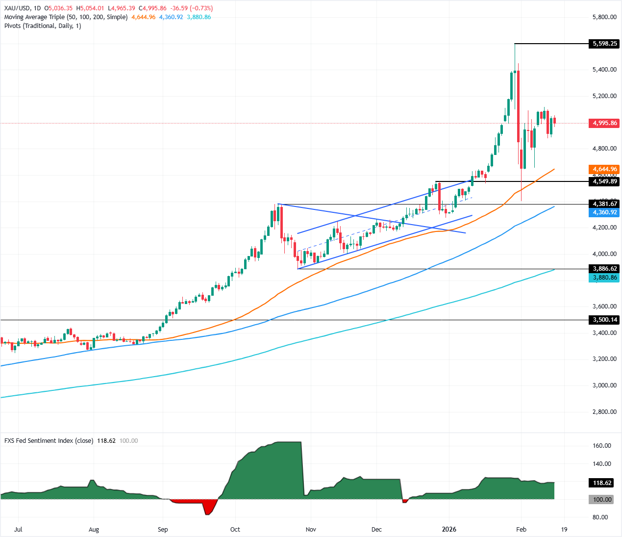 相反,如果金价收于5000美元以上,第一个阻力位将是5050美元,随后是2月11日的高点5119美元。