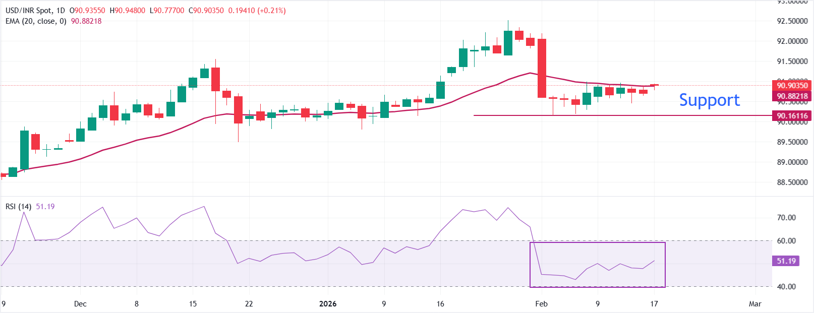 美元/印度卢比(USD/INR)在𫔭盘时交易于约90.9035,价格略高于20日指数移动平均缐(EMA)90.8822。20日EMA在最近几次回落后趋于平坦,指向盘整。