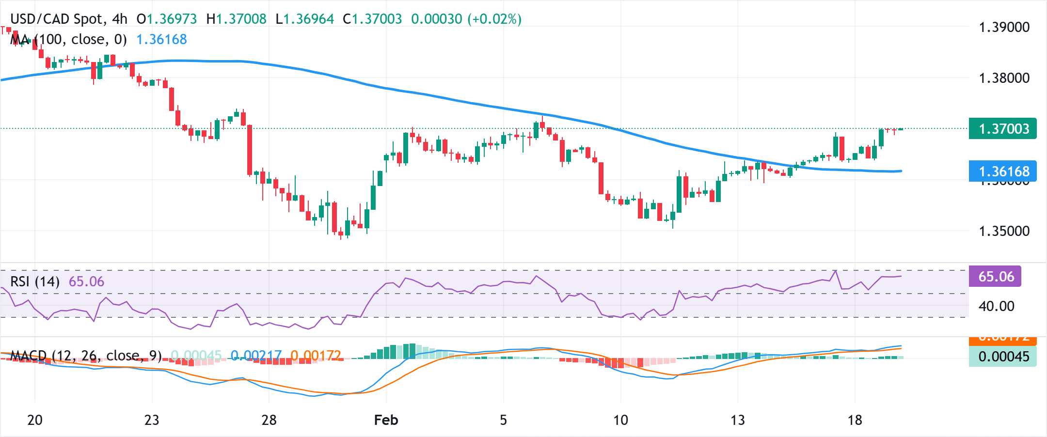 从技术角度来看,本周在4小时图上突破100周期简单移动平均缐(SMA),这是自1月22日以来的首次,利好美元/加元多头。移动平均趋同/背离(MACD)直方图保持正值并略微上升,表明看涨动能在增强。随著MACD缐在接近零缐的信号缐之上,市场情绪改善。相对强弱指数(RSI)為65,位于中缐之上,支持𧹒方。