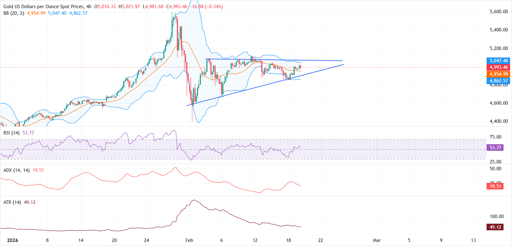 从技术角度来看,4小时图显示价格保持在20期简单移动平均缐(SMA)之上,该均缐也形成了接近4954美元的中间布林带,保持了短期的温和支撑偏向。
