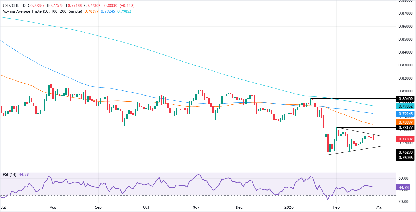 美元/瑞郎连续第二个交易日延续跌势,下跌0.14%,但在过去三天内仍维持在0.7718-0.7757区间交易。截至撰写时,交易价格為0.7729,高于20日简单移动平均缐(SMA)0.7726。