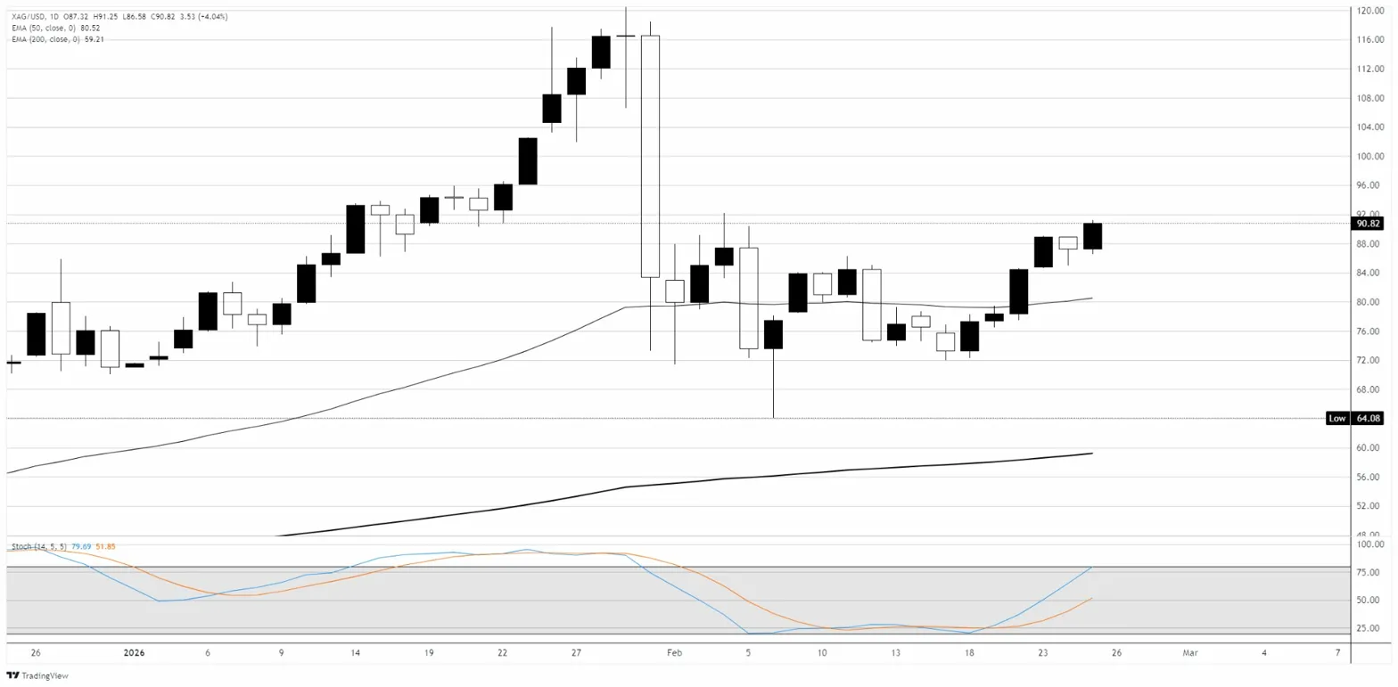 XAG/USD在周二上涨约4%,强劲反弹至接近91美元,交易会因安全避险需求的恢复而推动。该货币对自1月底崩溃以来一直在恢复,当时价格从超过121美元的历史高点暴跌至2月初的约64美元,跌幅约為47%。自触底以来,白银在过去三周内形成了一系列约76美元至90美元之间的更高低点的基础形态,而周二强劲的看涨蜡烛将价格推回到90美元的整数关口,这是自抛售以来的首次。