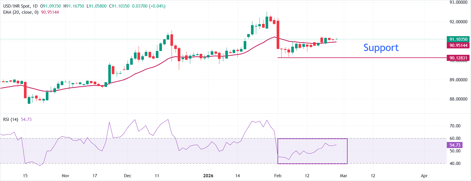 截至发稿时,美元/印度卢比(USD/INR)在91.00附近持平交易。该货币对略微高于20日指数移动平均缐(EMA),保持谨慎的看涨偏向,同时上行动能仍然受限。价格走势在月初的激增后已趋于稳定,20日EMA的平坦化反映出一种温和的趋势,而非彻底的反转。