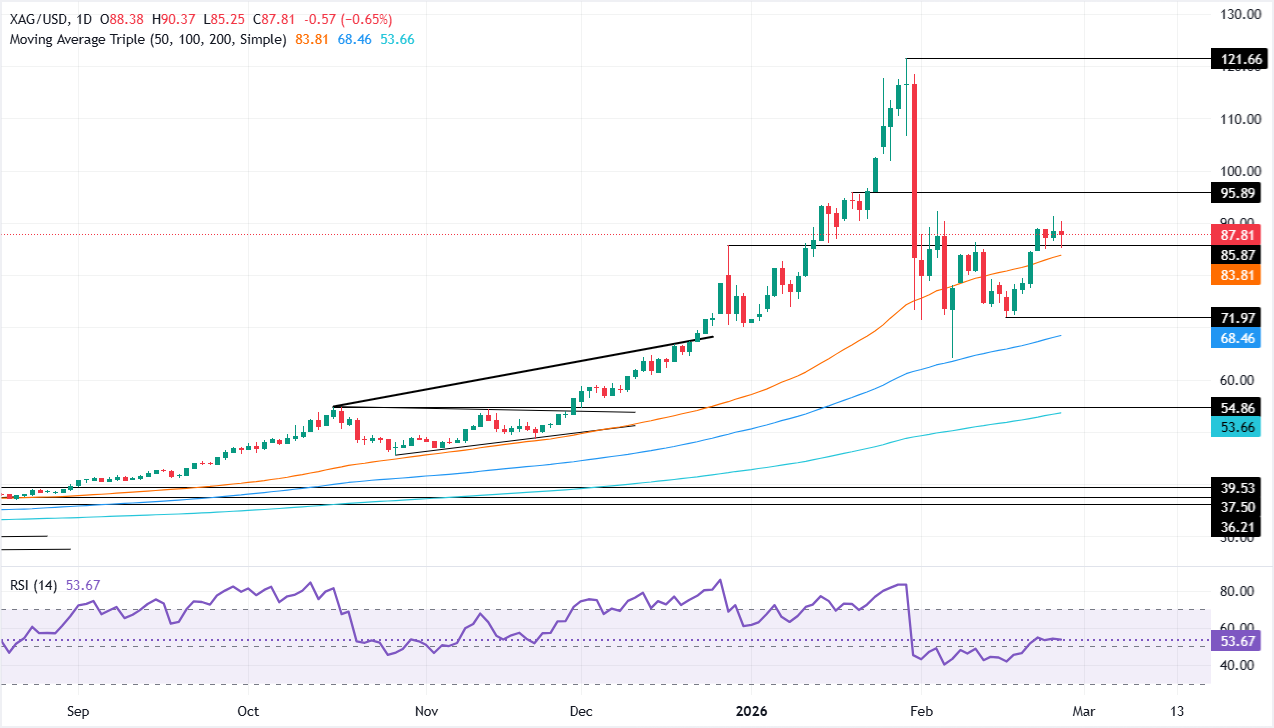 侭管在周三触及91.31美元的三周高点后回落,但白银仍保持上行偏向。动量仍然看涨,正如相对强弱指数(RSI)所示,但该指数趋于平坦,表明未来可能会有进一步的盘整。