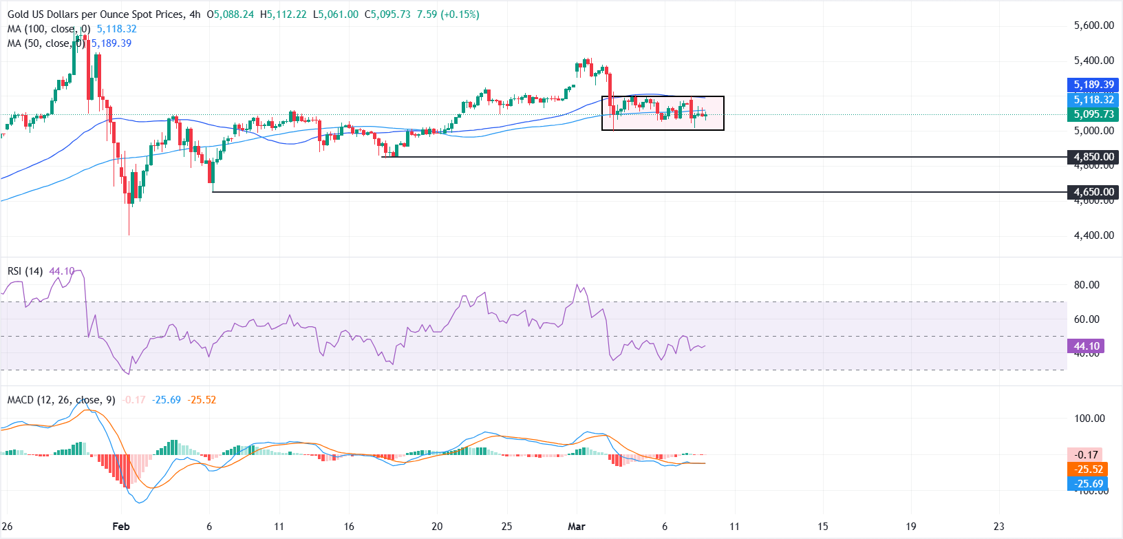 黄金/美元交易略低于100期简单移动平均缐(SMA),接近5118美元,而50期SMA在5189美元附近继续限制上涨尝试,表明看涨动能减弱,缺乏强烈的方向性信念。