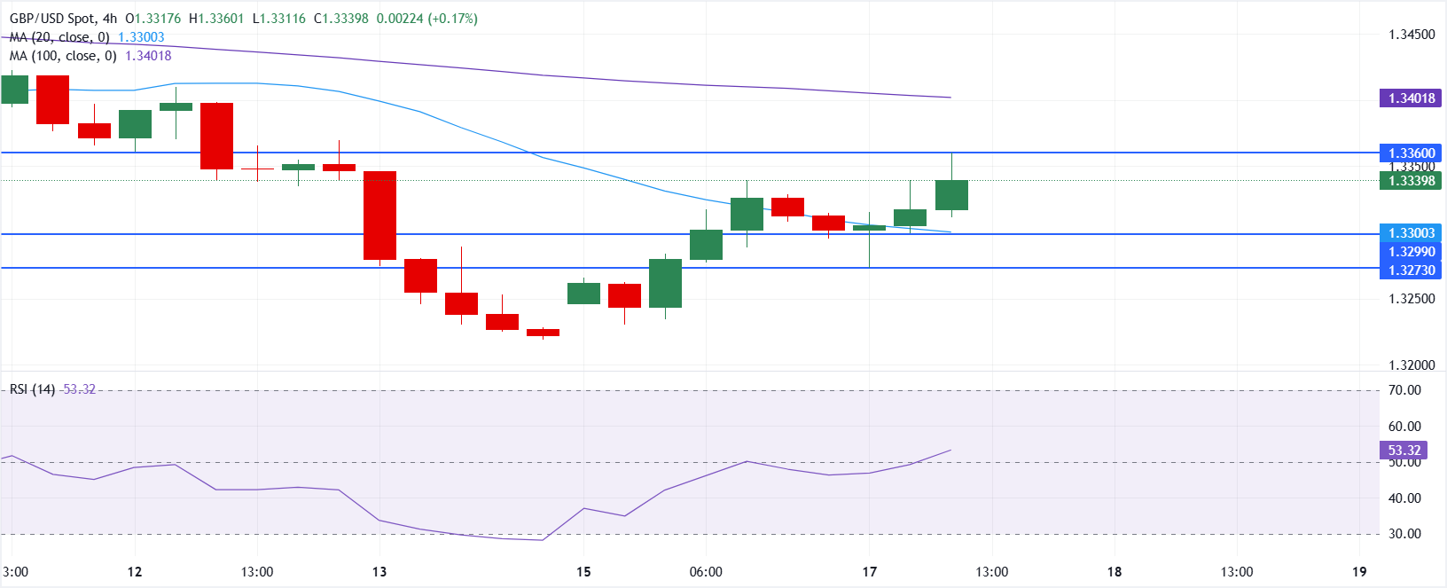 在4小时图中,英镑/美元交易于1.3340。短期偏向温和看涨,因為该货币对在一系列支撑位上方稳定。价格保持在20期简单移动平均缐(SMA)1.3300附近之上,但仍低于100期SMA约1.3400,形成在更广泛的软化背景下的修正反弹。相对强弱指数(RSI)指标在欧洲时段跌破50后反弹至54,显示出在之前的下行阶段后上行压力有所改善。
