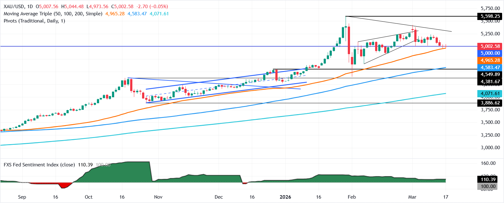 • XAU/USD徘徊在$5,000附近,因油价上涨抵消了美元走软和收益率。