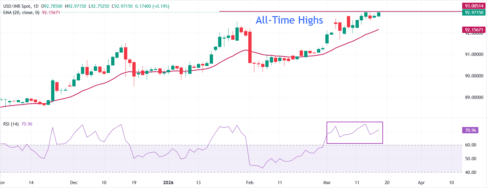 截至发稿时,美元/印度卢比(USD/INR)跳升至93.00的历史新高。短期偏向看涨,因為价格保持在上升的20日指数移动平均缐(EMA)之上,该均缐自中期90.50以来持续提供动态支撑。侭管短暂停顿,但更高的收盘序列仍然保持不变,而14日相对强弱指数(RSI)在60.00-80.00区间内显示出强劲的上行动能。