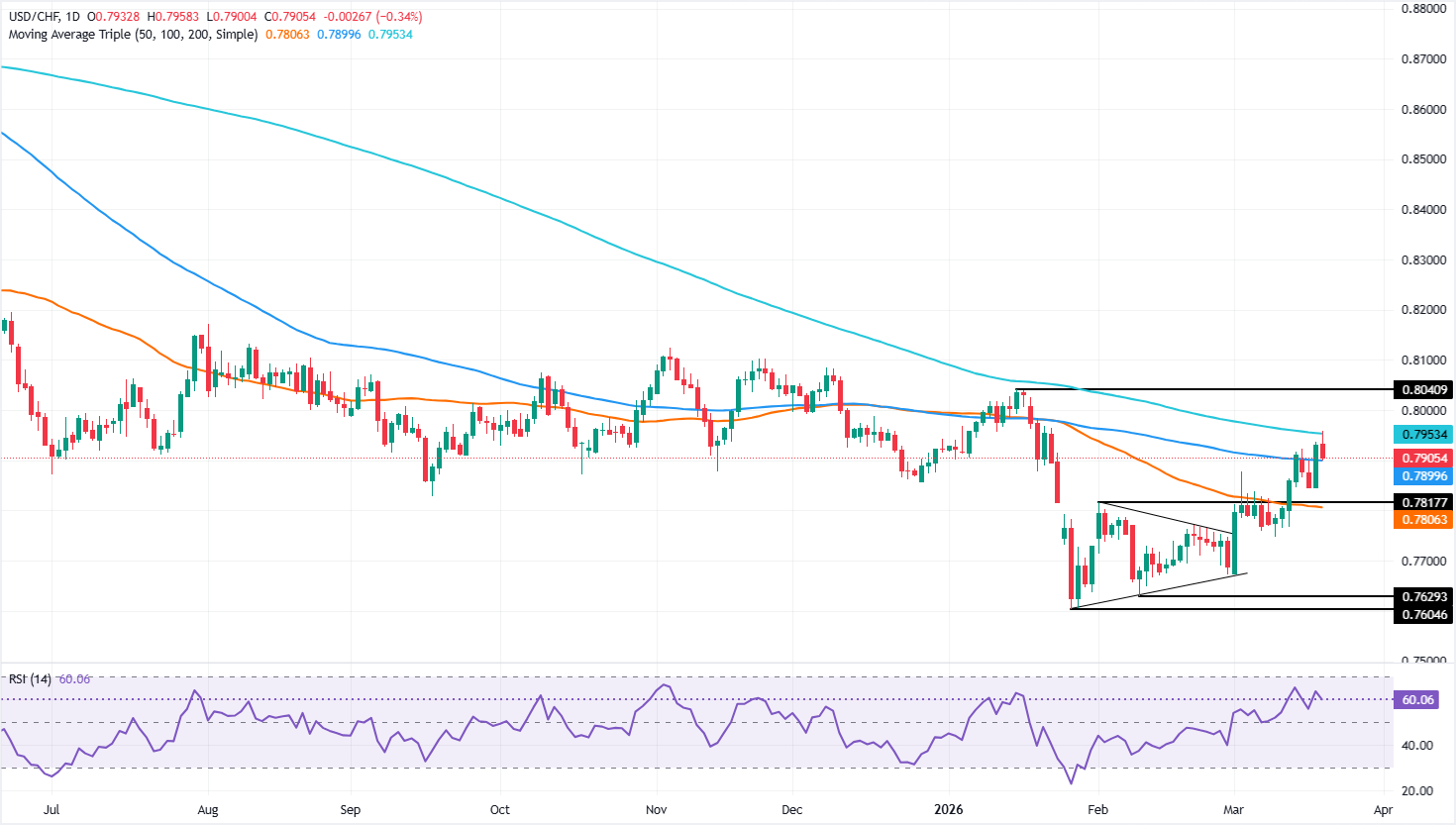 侭管瑞士央行(SNB)在外汇市场进行了口头干预以贬值瑞士法郎(CHF),美元/瑞郎(USD/CHF)货币对在周四北美时段交易中表现较為疲软。美元(USD)的广泛疲软使该主要货币对下跌0.31%,至0.7906。