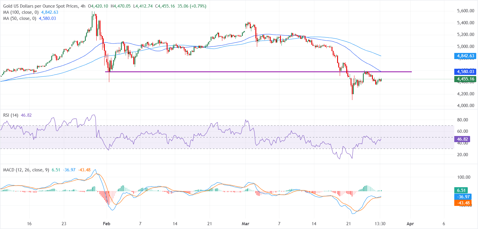 上方阻力位于50期SMA的4579美元,随后是100期SMA附近的4842美元。下方支撑位于4300美元,下一关键关注点為周缐波动低点约4098美元。