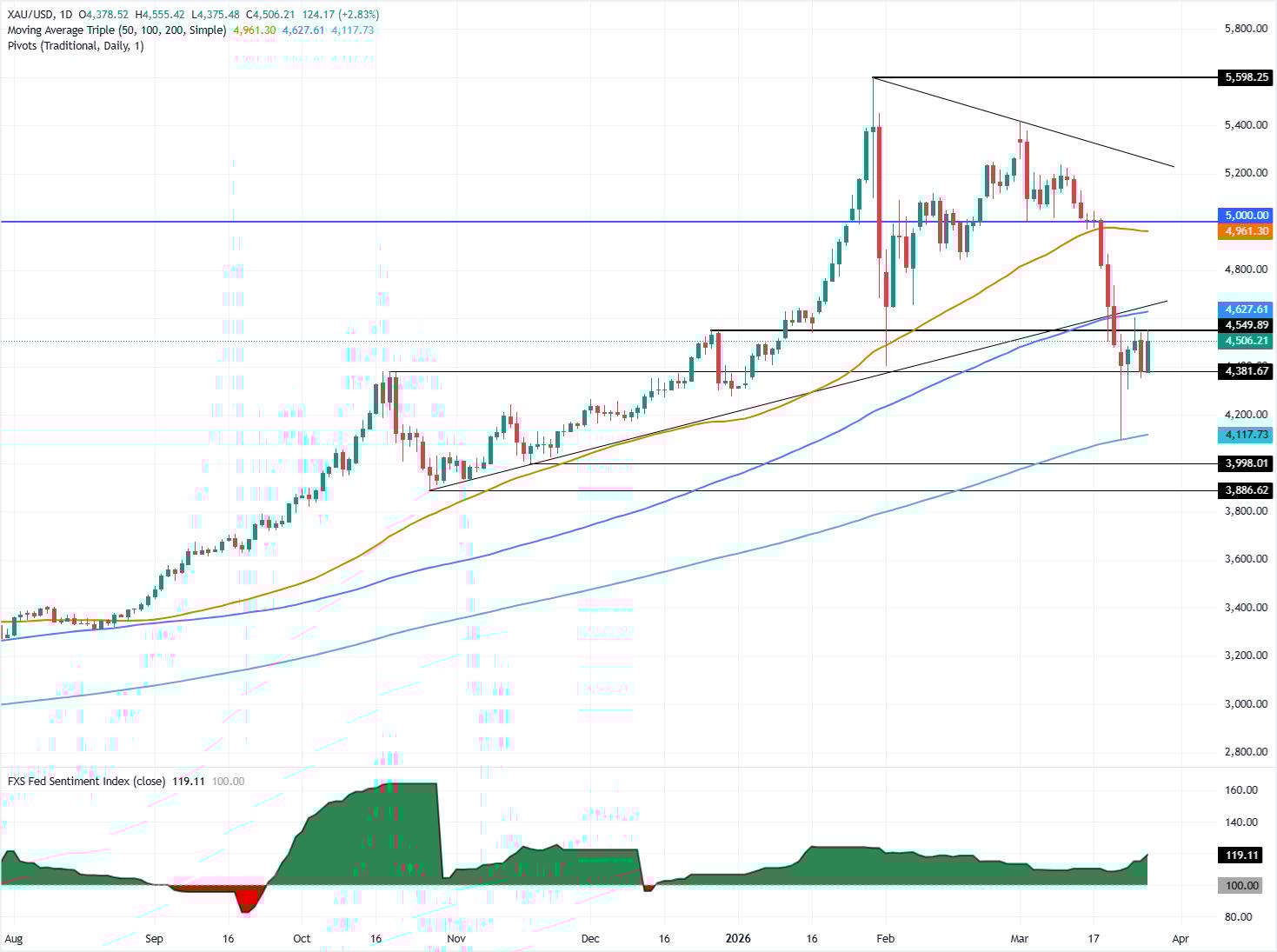 下行方面,若金价日缐收于4,500美元以下,下一个支撑位为3月24日的日低4,306美元,随后是3月23日的波段低点4,098美元。