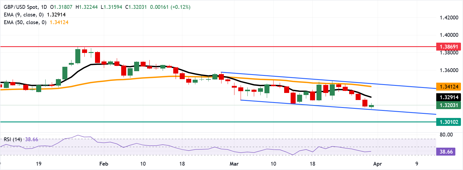 英镑/美元终止了连续五天的跌势,周二亚洲时段交投于1.3200附近。日缐图的技术分析显示,随著该货币对在下降通道形态内下行,空头偏好依然存在。
