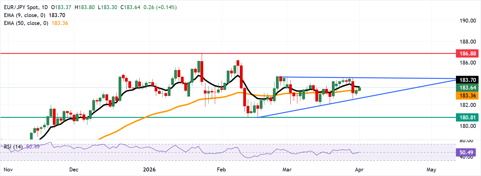 欧元/日圆连续第二个交易日上涨,周三亚洲时段交投于183.60附近。日缐图的技术分析显示,该货币对在上升三角形形态内横盘,反映出𧹒盘压力。