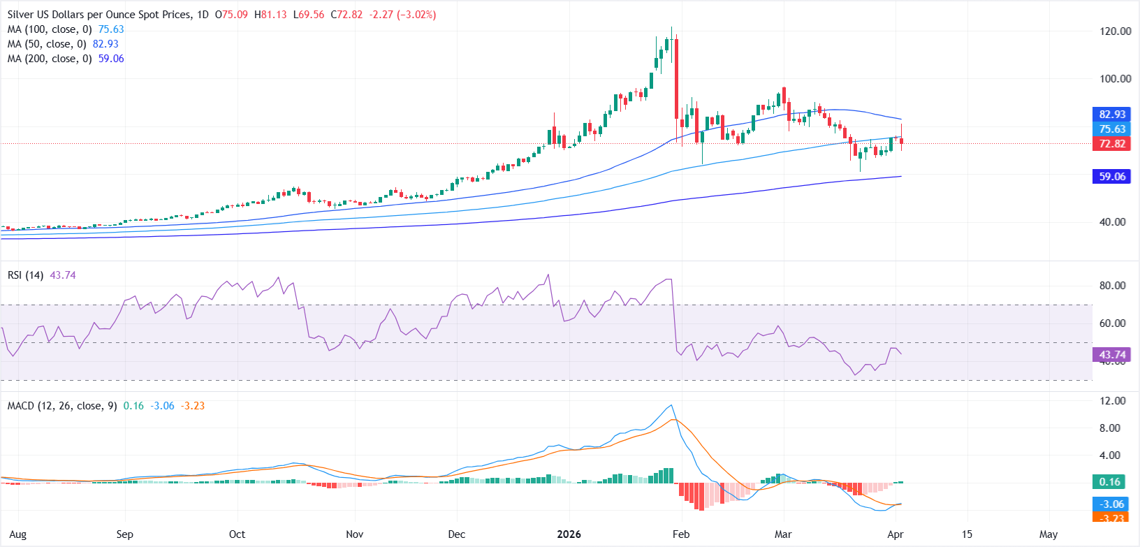 从技术面看,XAG/USD短期内仍偏向看跌,100日简单移动均缐(SMA)约75.63美元处的多次拒绝限制了上涨尝试。然而,该货币对仍守稳于200日简单移动均缐59.06美元之上,表明侭管近期走弱,整体上升趋势依然完好。
