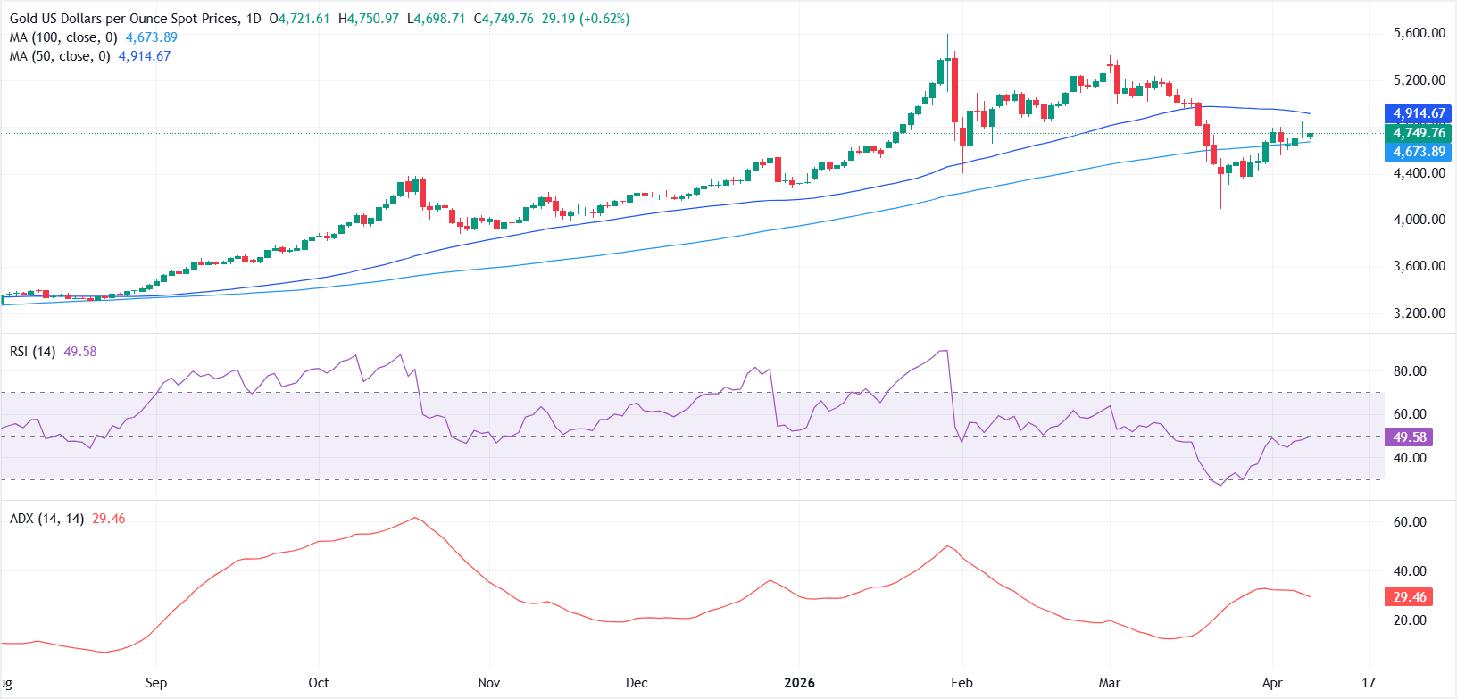 上方阻力由50日SMA4914.57美元强化;若日收盘价突破该阻力,将重新打𫔭通往前高的路径,并使多头偏好回归。下方初步支撑位于100日SMA附近的4673.84美元;若持续跌破该水平,黄金/美元可能面临更深调整,表明空头重新掌控市场。