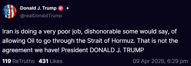 美国总统唐纳德·川普:伊朗通过霍尔木兹海峡处理石油的方式不是我们达成的协议