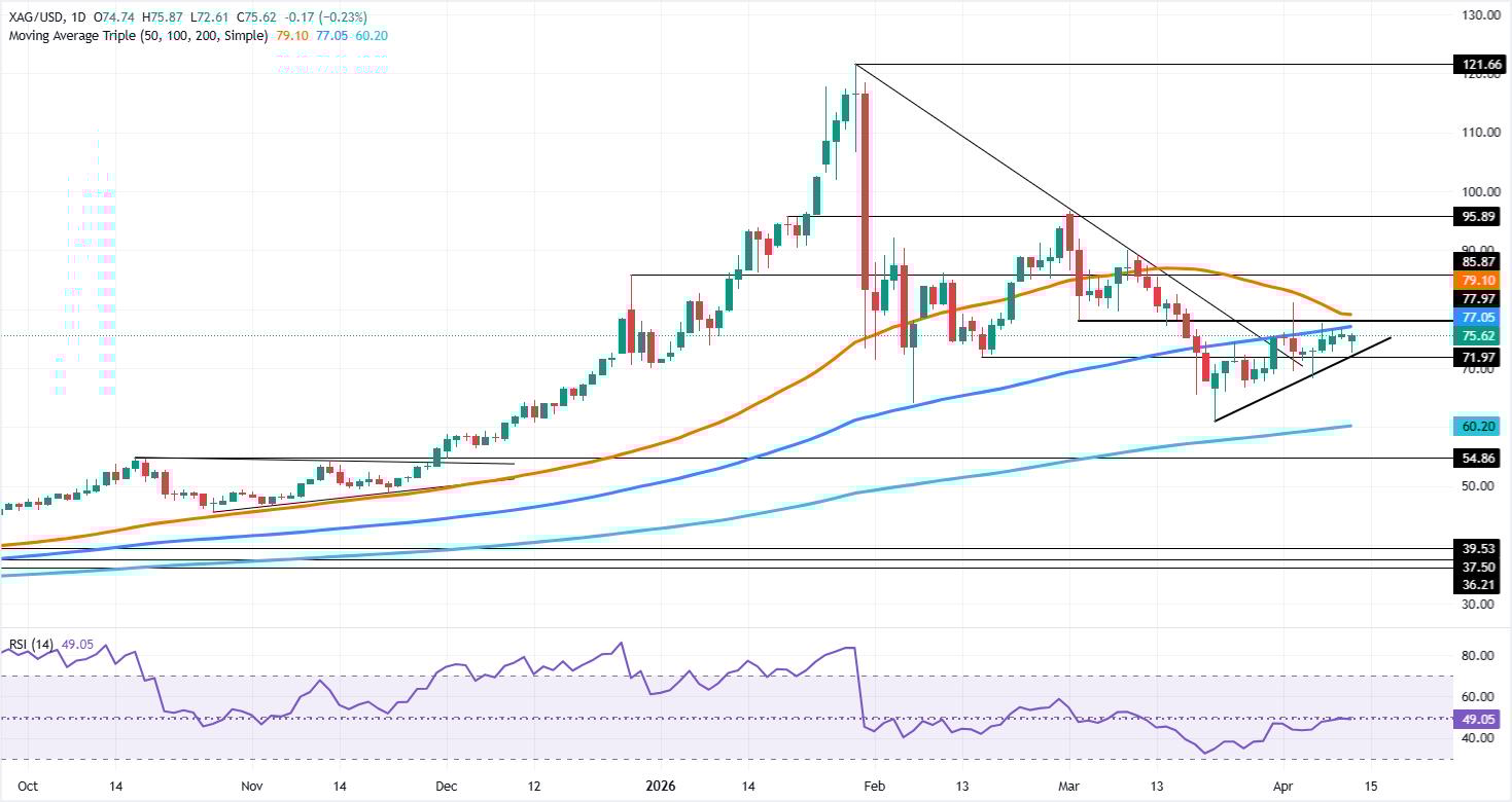 白银价格预测:反弹在100日均缐受阻,卖家关注75美元关口