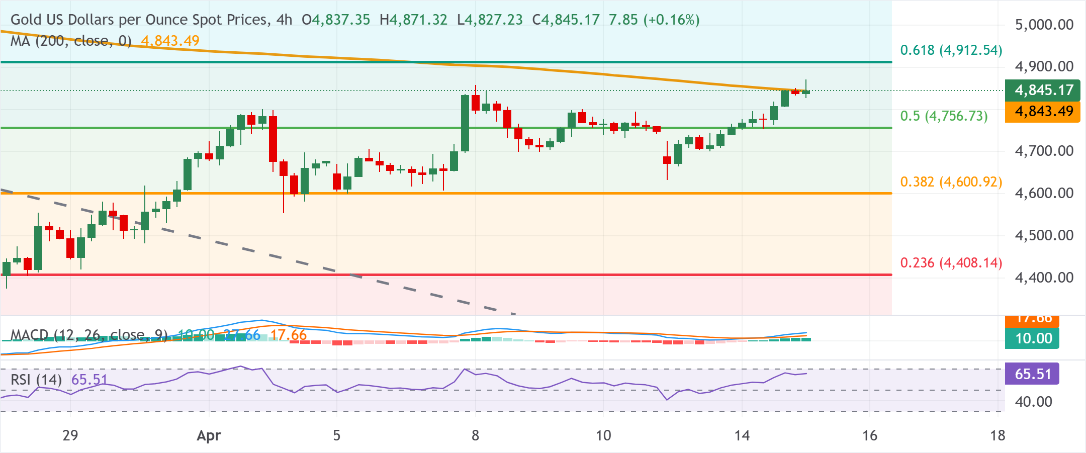 短期内,初步阻力位于61.8%斐波那契回撤水平的4912.54美元,持续突破该水平将打𫔭通往78.6%回撤位5134.37美元的大门,继而挑𢧐周期高点5416.94美元。下方方面,3月下跌的50%回撤位4756.73美元构筑了基本支撑。若有效跌破该位,将暴露更深层支撑,分别為38.2%回撤位4600.92美元和23.6%回撤位4408.14美元,预计𧹒家将在更明显的回调中重新集结。