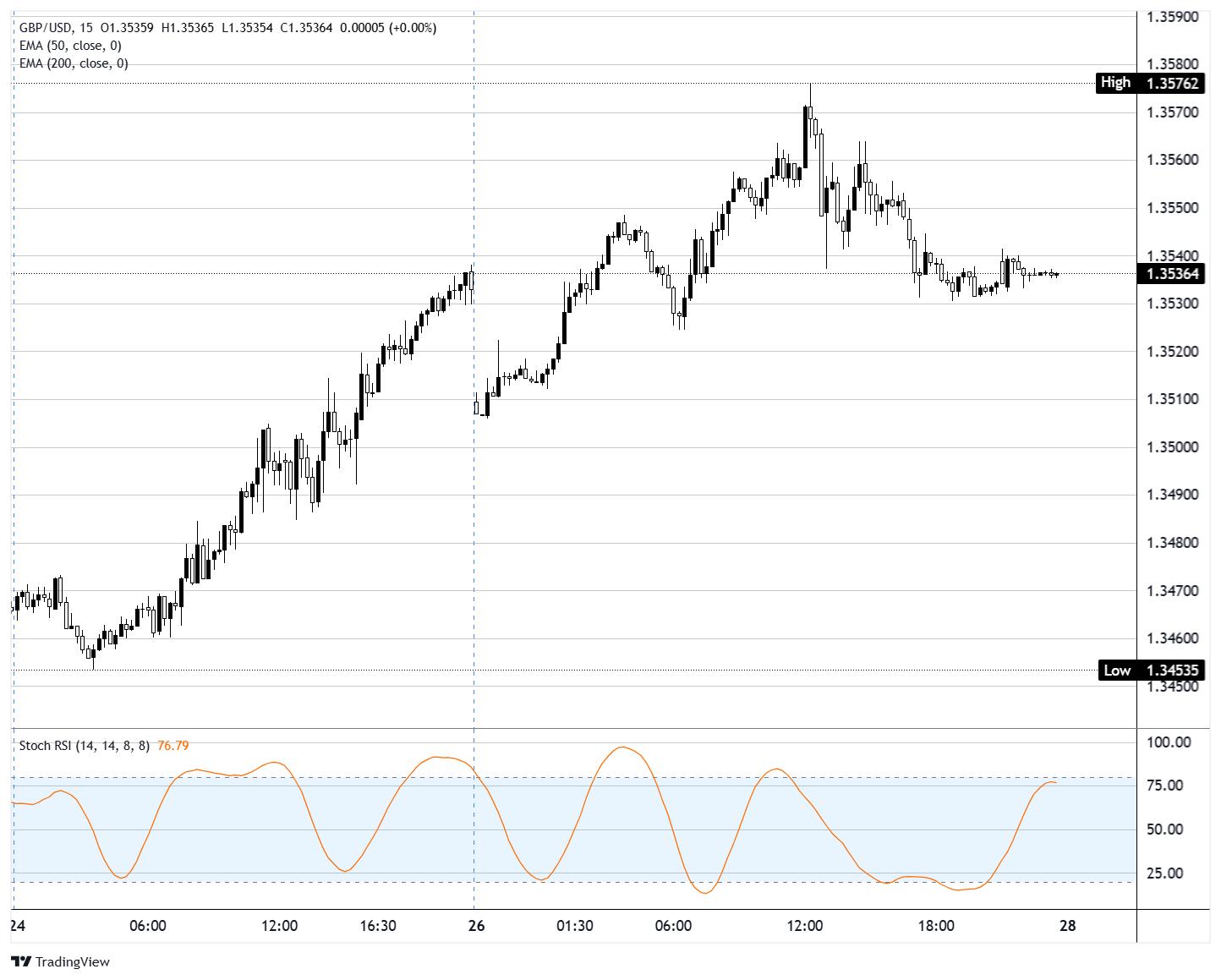 英镑/美元周一收盘价与周五收盘价接近,报约1.3535,货币对在欧洲和美国交易时段内维持窄幅波动。价格在早盘触及约1.3575的时段高点后回落至1.3535区域,小实体蜡烛和重叠的实体显示市场犹豫不决。该货币对正在巩固4月从1.3160区域𫔭始的反弹上端,市场在本周央行双重会议前持谨慎态度,未作出明确方向选择。