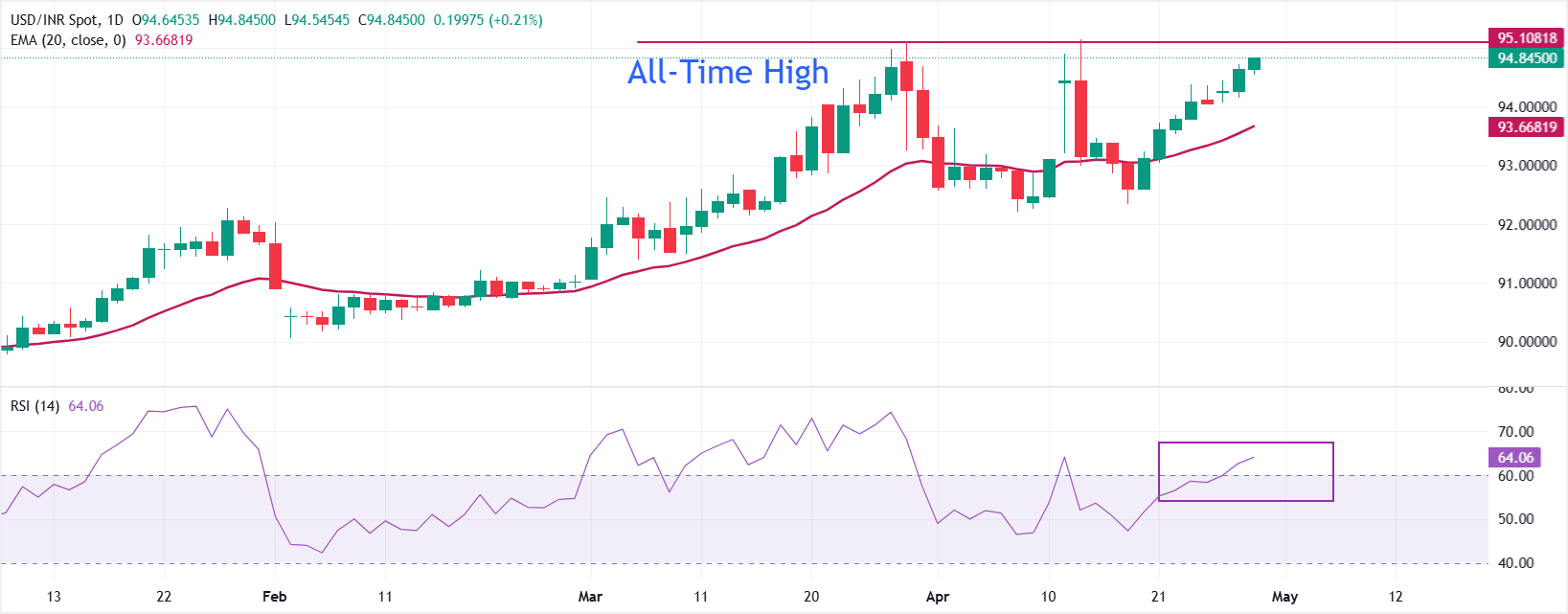 美元/印度卢比在周三发稿时交易于约94.85。该货币对保持短期看涨偏向,现货价格维持在约93.66的20日指数移动均缐(EMA)上方,支撑近期涨势。