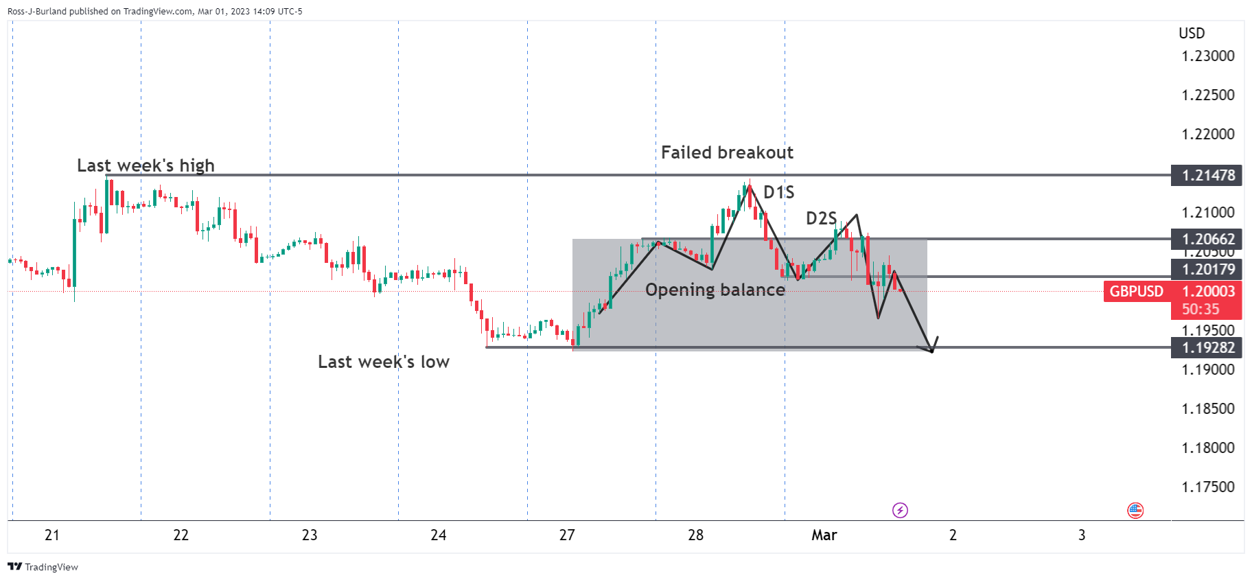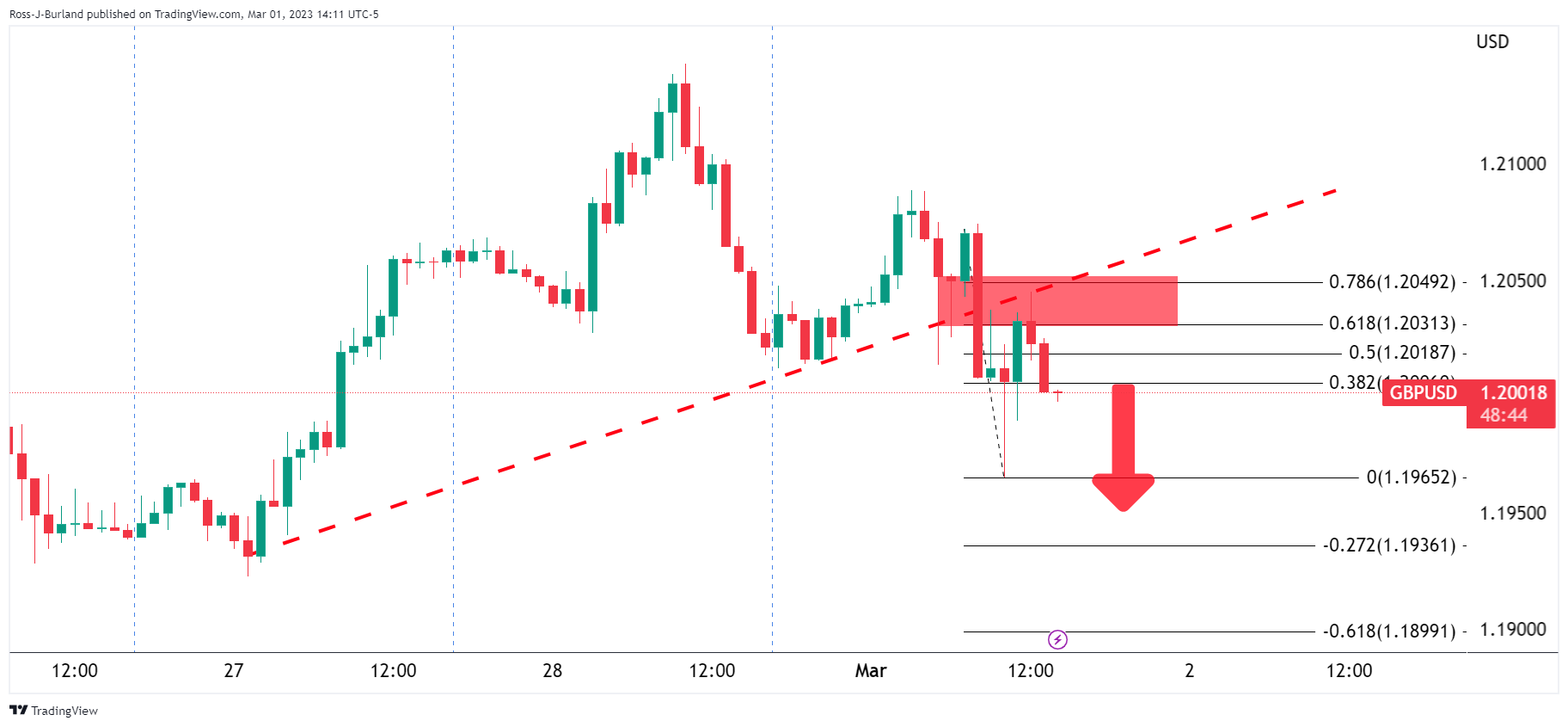 放大头肩形态,空头正占主导,并在1.2050区间遇到阻力,并指向上周低点。