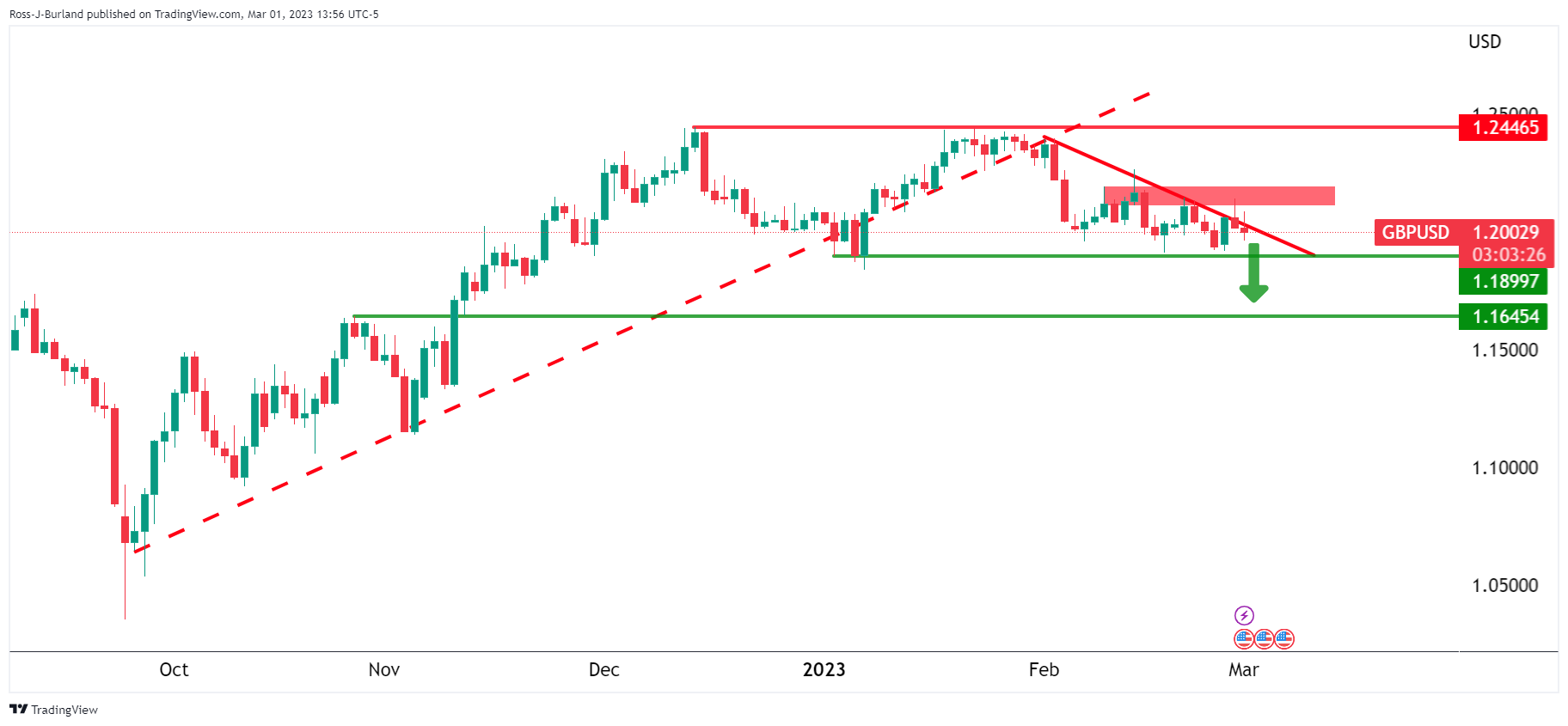 然而,英镑/美元正出现下行倾向,如以下技术分析所示: