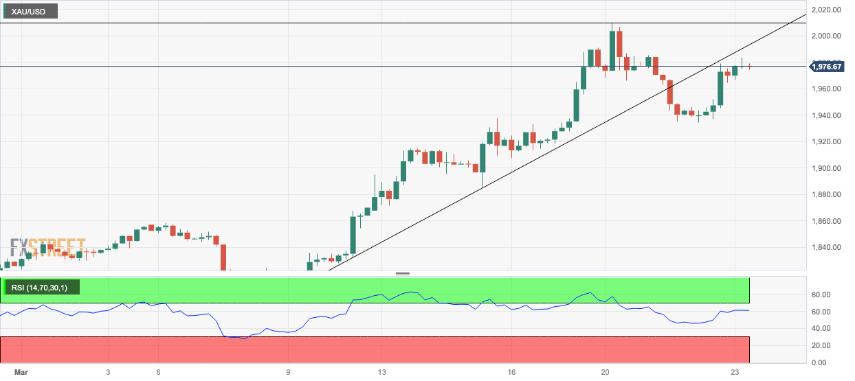 周三3月FOMC会议后金价飙升,达到1978美元高点,接近周四欧洲会议𫔭始时的交易水平。美国联邦储备委员会(FED)表示,由于银行业压力导致的信贷条件收紧可能会替它完成降低通货膨胀的工作,因此它可能不必像预期的那样在未来加息,弗里吉亚国王米达斯(Midas of Phrygia)锺爱的矿石因此而上涨。
