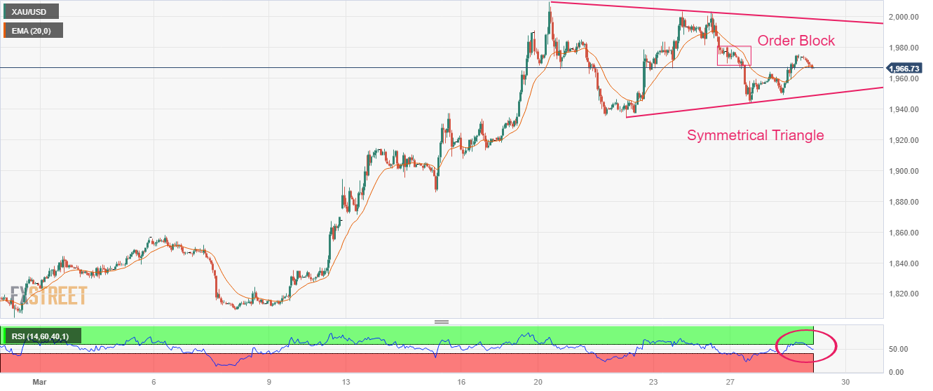 金价回调接近一小时图上的此前订单区域(1,968-1,980美元)后下跌。从更广泛的角度看,金价处于一个对称三角形内。金价正努力维持在20EMA均缐1968美元上方。