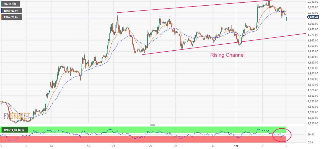 小时图显示金价交投于上升通道中,整理被市场视為做多机会。金价正试图保持在2,000.00美元的阻力上方。