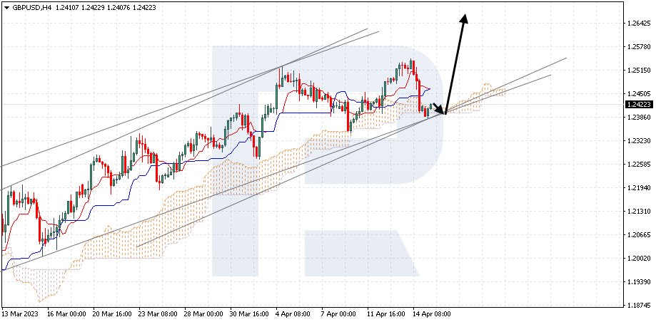 该货币对自看涨通道的下边界起飞。价格位于一目均衡图上方,表明处于上行趋势中。汇价料测试云图的下边界1.2395,然后上涨至1.2645。确认上涨的进一步信号将是自看涨通道的下边界反弹。若跌破云图下边界并维持在1.2365下方,上涨情形将失效,汇价将进一步下跌至1.2275。