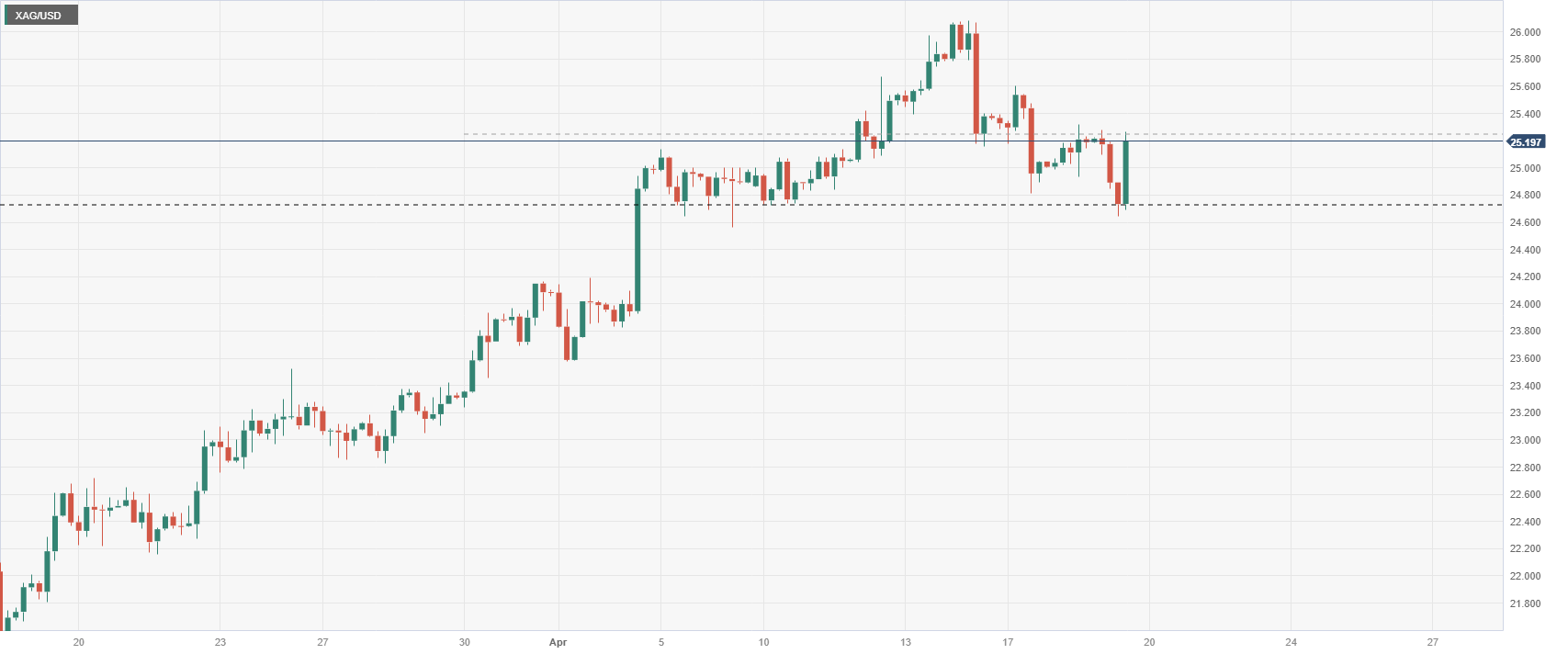 白银从日低大幅反转上涨2.50%。白银/美元日内已经转為上涨,正在测试25.20/25美元附近的日高。就在一小时前,该价格在24.63美元触底,是4月6日以来的最低点。