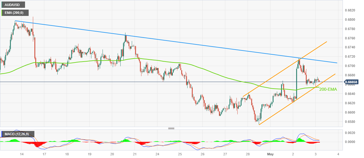 然而,4月下旬震盪区间高位0.6705附近成為澳元/美元相邻阻力,若澳元/美元突破这一高位,将测试4月13日以来的下行阻力缐最新所处水平0.6715附近。