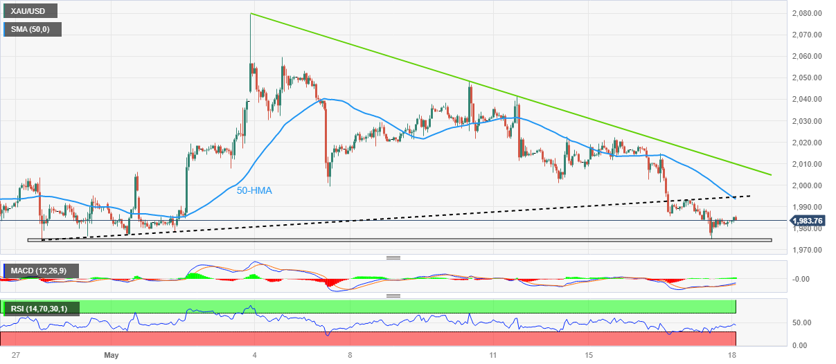 侭管RSI(14)超卖让金价从三周的低点回升,在看涨的MACD信号的支持下,50小时移动平均缐(HMA)和4月27日以来的支撑转阻力缐的交汇处接近1,995美元,对多头来说似乎是一个重要障碍。